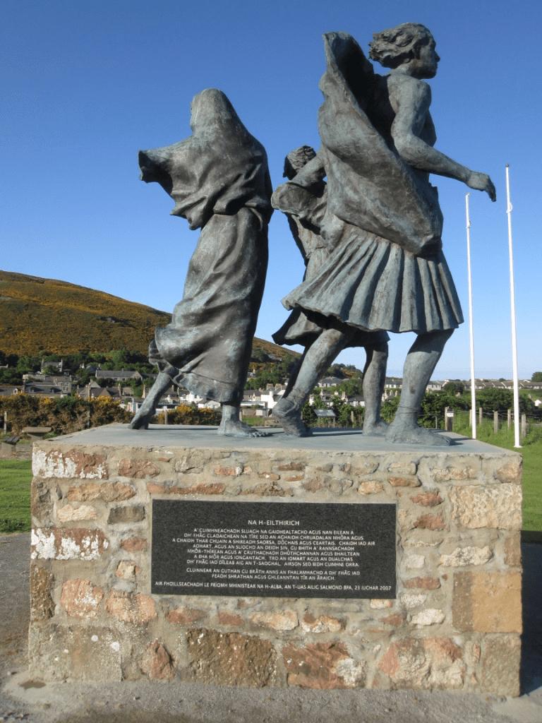 Afterwards, I did stop at the pub and asked some local patrons about both peak displays. Not knowing who I was, no one would talk about it. I later learned that the statue in the distance was of the 1st Duke of Sutherland, known as the “Mannie.” I later learned that there have been repeated attempts by locals to vandalize, desecrate, destroy, or even blow up the statue. https://www.bbc.com/news/uk-scotland-highlands-islands-15924649 As I walked around town, I came upon another statue known as The Emigrants. A profound and moving tribute it is engraved as follows: